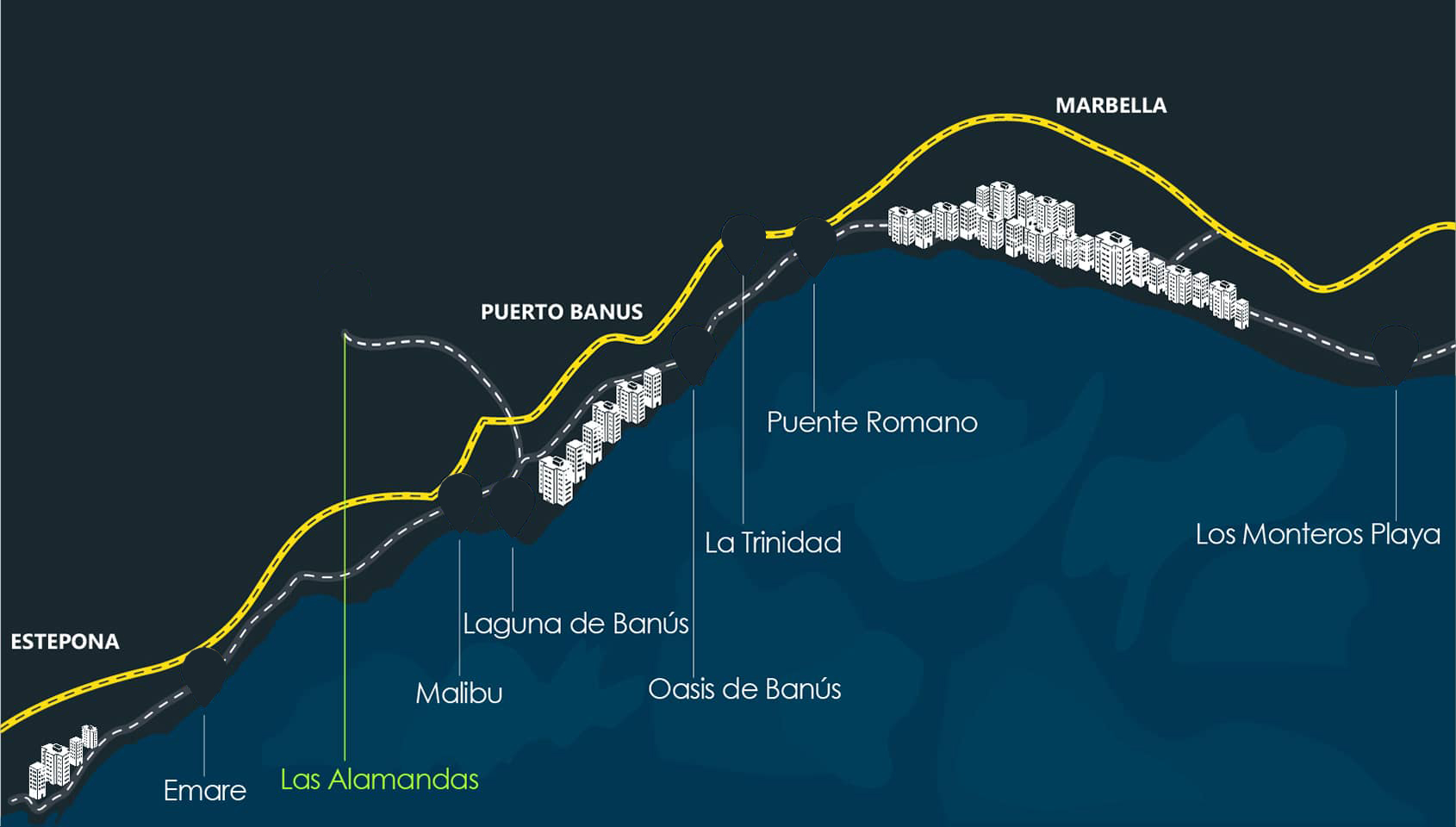As in all our Five Star Urbanisation locations, LAS ALAMANDAS is conveniently located for all your typical every-day and night-time needs. Whether that be a quick walk to the beach, a trip to the supermarket. or perhaps a drive to explore some of the other beautiful towns & cities here on the Costa Del Sol. Below we have for your consideration a rough travel time guide to different locations, whether by car or by foot.