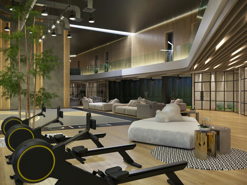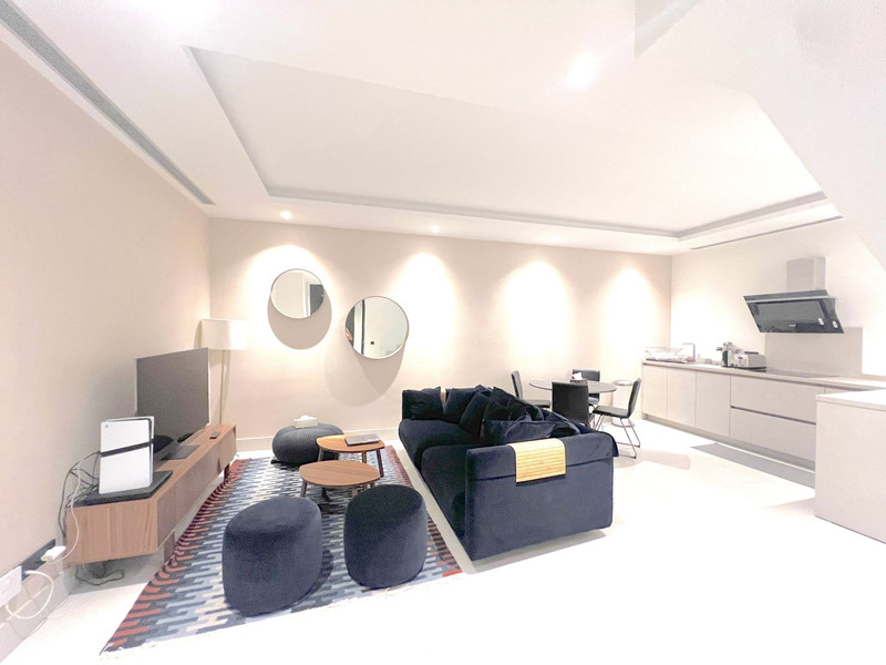 The property is spread over two floors. On the main floor, there is a spacious living-dining area with a fireplace and floor-to-ceiling windows that flood the space with natural light and provide direct access to the terrace and communal areas. The Fendi-designed kitchen is integrated into the living room, creating an open and modern atmosphere. The master bedroom includes a large en-suite bathroom with both a bathtub and shower, as well as large windows that offer plenty of light and access to the terrace. This floor also features a uniquely designed guest bathroom and two spacious bedrooms, each with its own en-suite bathroom.