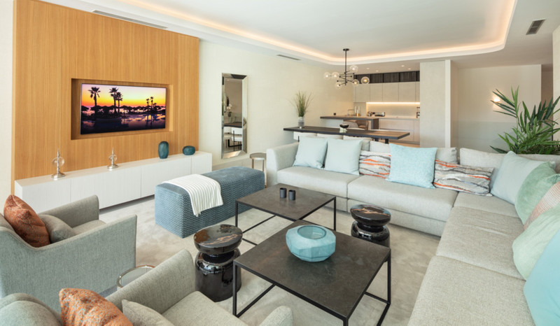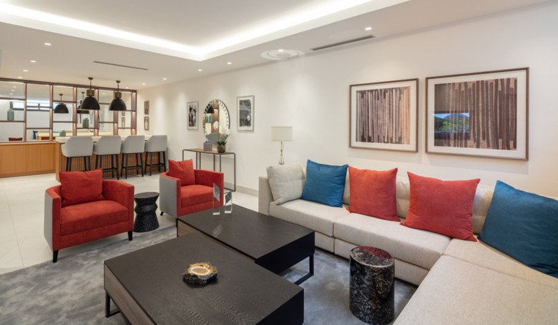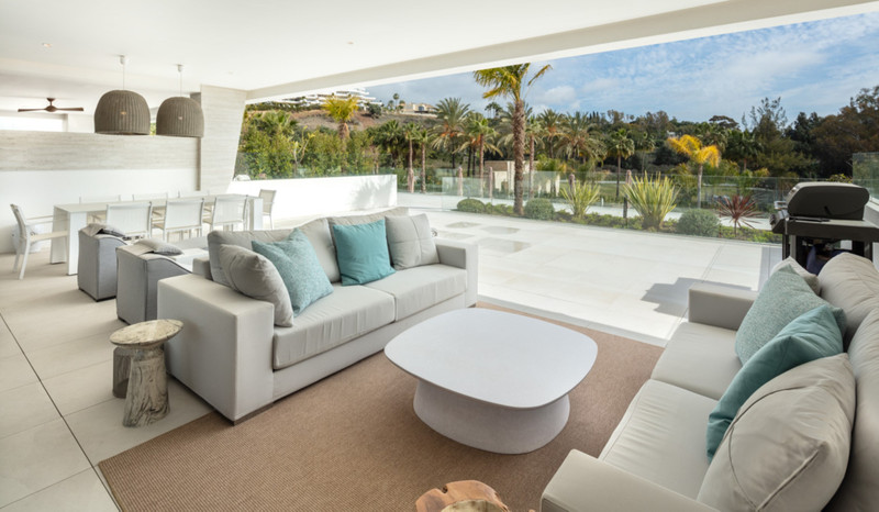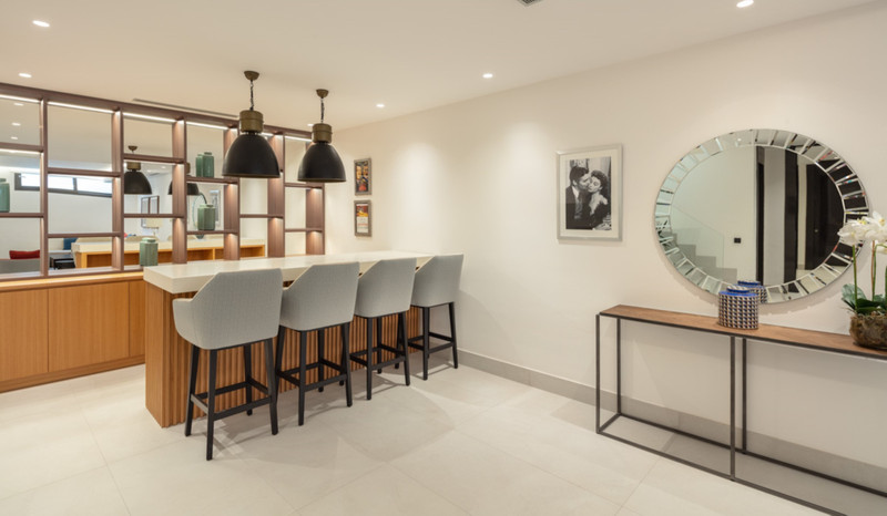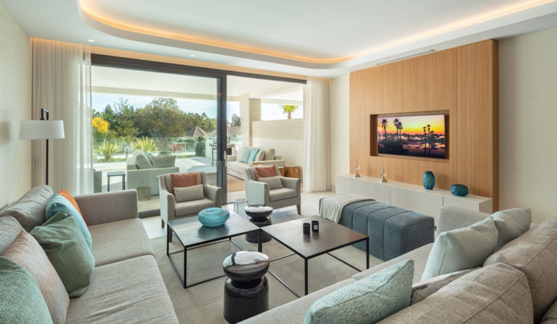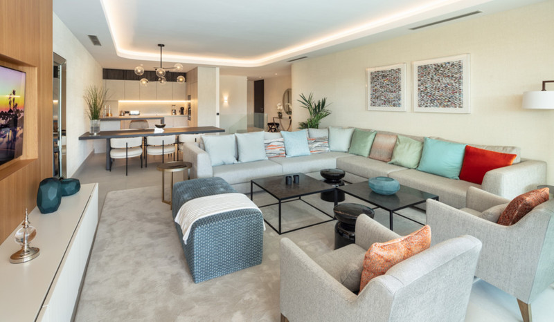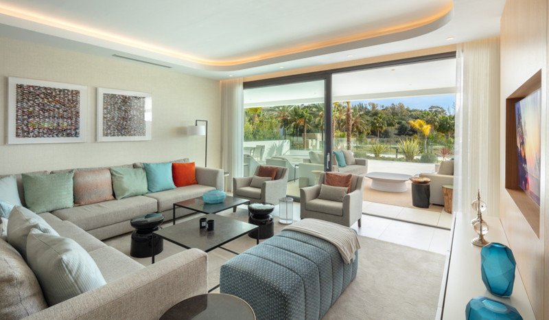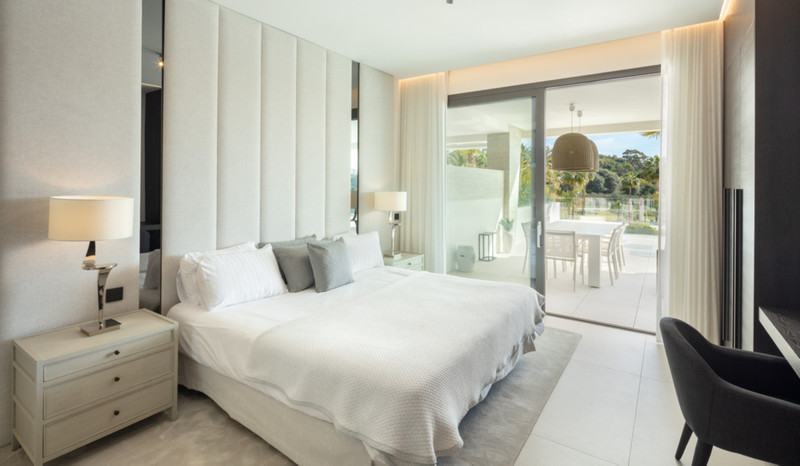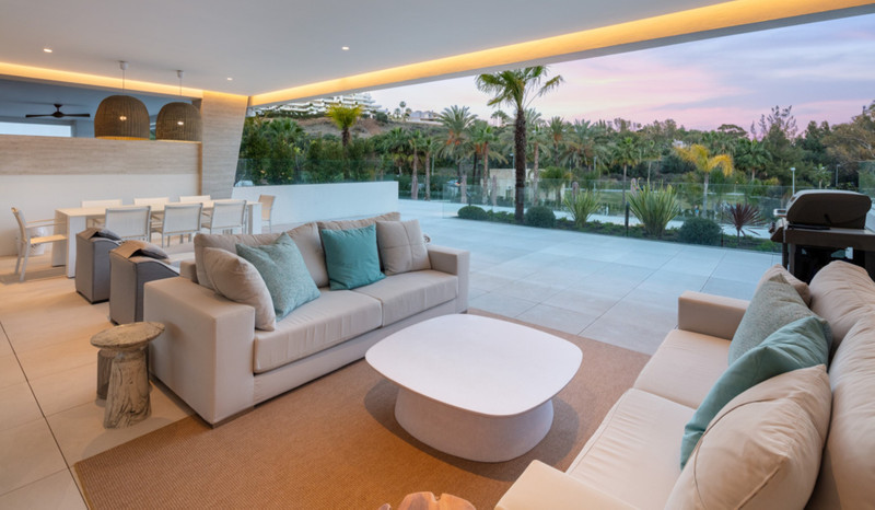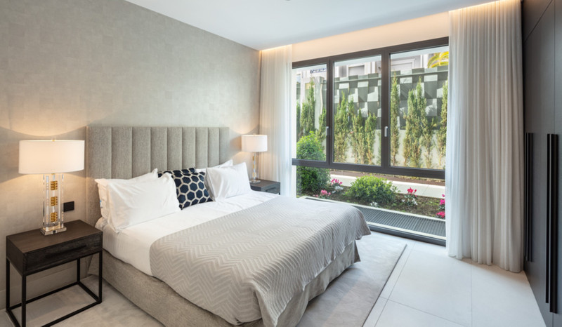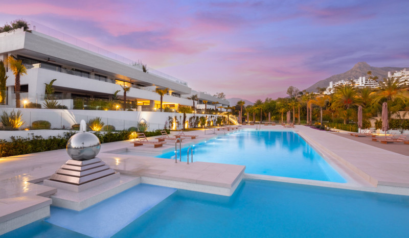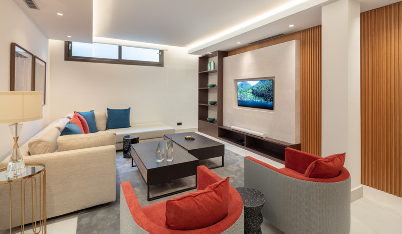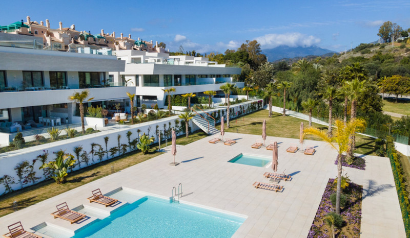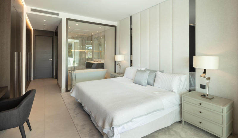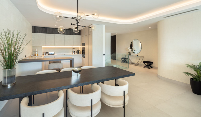 Contemporary duplex apartment located in the heart of Marbella’s famed Golden Mile. The apartment boasts bright modern interiors leading effortlessly onto the expansive terrace, overlooking the manicured gardens and immaculate views. The first level consists of 3 custom designed bedrooms, each with their own en-suite bathroom, while the lower level offers a spacious entertainment level with TV room, a cocktail bar and a double bedroom. The apartment is located within a newly built resort-style complex offering bespoke design, providing some of the most exclusive and exceptional amenities such as gym, SPA and Social areas and located within minutes to Puente Romano Resort and the beach.